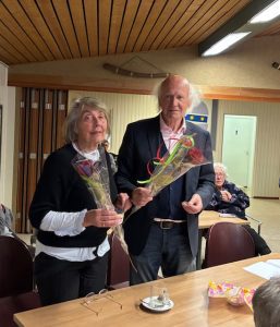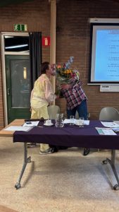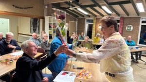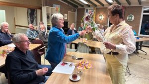 Een bos bloemen werd gegeven met daarbij de uitnodiging voor een wandeling in Twentse natuur met als afsluiting een etentje met alle bestuursleden